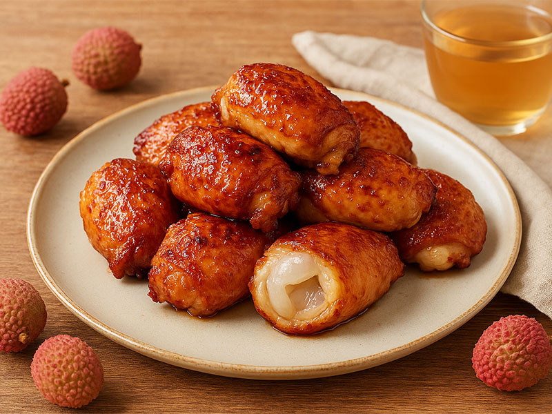 2. 荔枝去核,把果肉釀入雞翼內