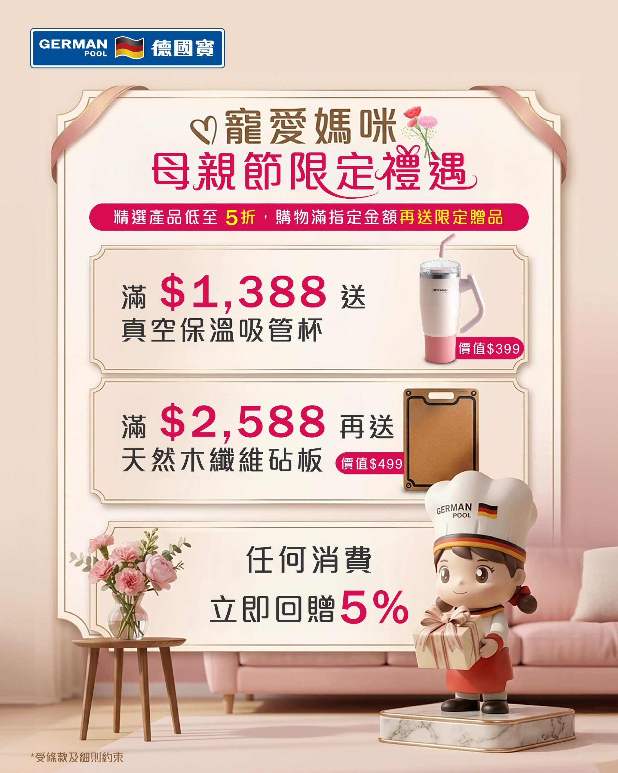 此外,凡於德國寶 eStore 網上專門店作任何消費,更可即時享有 5% 回贈,讓你在選購心儀產品之餘,同時享受額外優惠,真正做到精明消費,為媽媽送上最貼心之選。立即前往德國寶 eStore 網上專門店,為媽媽挑選一份最合適的禮物,將愛化為實際行動,讓她在每一天都感受到被珍惜、被呵護的幸福。