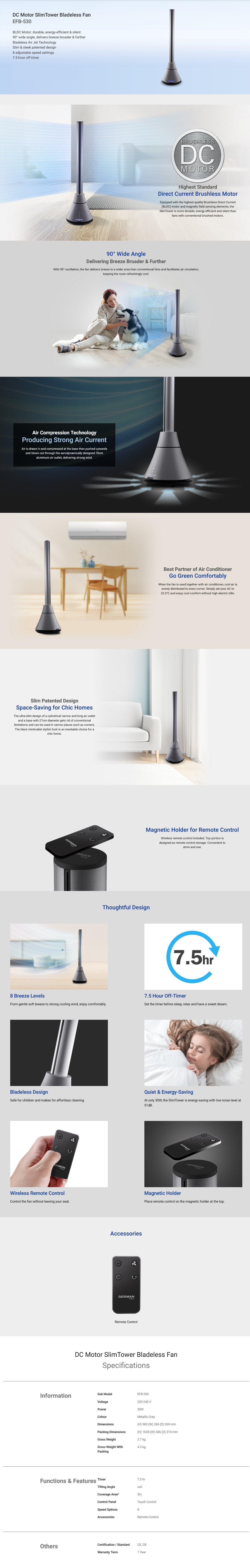 Equipped with the highest quality Brushless DirectCurrent (BLDC) motor and magnetic field sensing elements, the SlimTower is moredurable, energy-efficient and silent than fans with conventional brushedmotors.