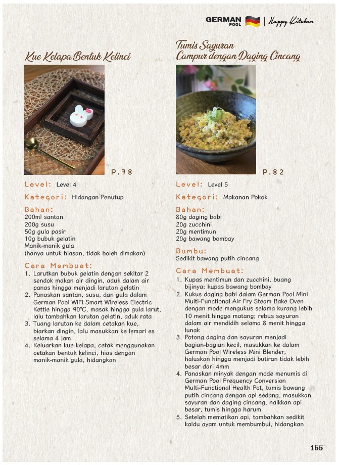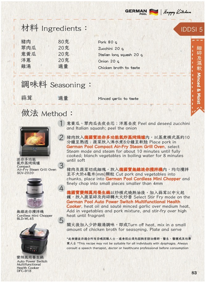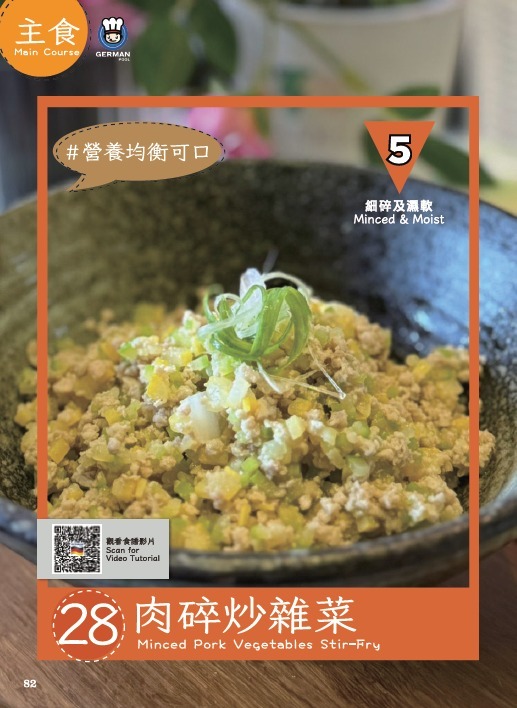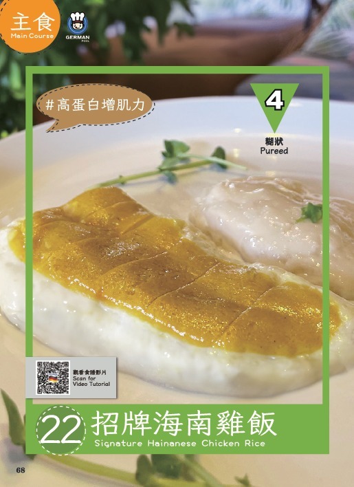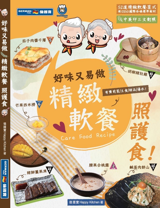 書內收錄共52道精心設計的照護食及精緻軟餐菜式,中文、英文、印尼文三語對照,從前菜、主食、甜品以至湯水,款式多樣化,務求讓嚥困難患者安心享用,感受進餐的愉悅與尊重,令每位家庭成員都可以品嚐相同美味,一家人盡情享受同枱共食的快樂—我們深信只要用心每一餐都是幸福滋味!誠意為您推薦德國寶「銀髮之寶」系列產品,在家輕鬆製作百變美味照護食及精緻軟餐,更可參加我們的照護食烹飪班,由專人教授實用照護食及精緻軟餐製作技巧和貼士,讓您能充滿信心為家人、老友記或吞嚥困難患者準備每一餐!